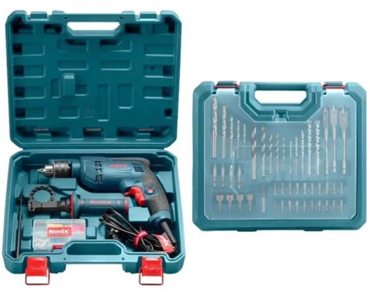 رونیکس 750 وات مدل RS-0005 ا Ronix Impact Drill Kit RS-0005 ست ترکیبی رونیکس مدل RS-0005، مجموعه کاملی از یک دریل چکشی و انواع ابزارآلات دستی و متعلقات مختلف است. این مجموعه کامل، برای استفاده در مصارف خانگی و صنعتی به کار شما میآیند. این ست کیف ابزار، در یک کیف مقاوم به ضربه BMC به بازار ابزار ایران و جهان عرضه میشود. دریل موجود در ست ترکیبی دریل برقی 54 پارچه رونیکس مدل RH-0005، مجهز به یک موتور 750 واتی بسیار قدرتمند برای بهترین کارایی در سوراخکاری و دریلکاری چکشی است و میتواند با سرعتی بالغ بر 2700 دور در دقیقه کار کند.