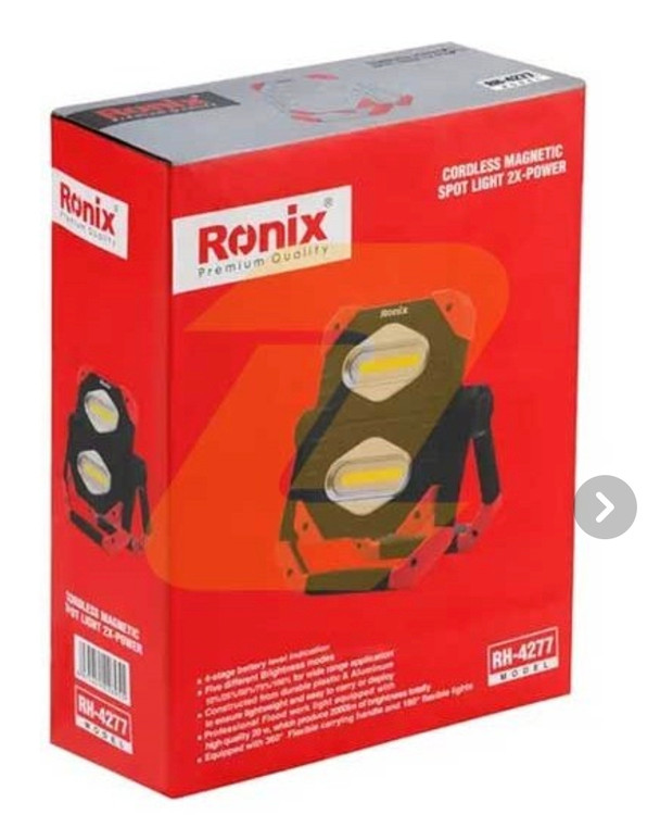 نورافکن شارژی رونیکس مدل RH-4277 مگنتی تاشو دارای LED کیفیت بالا 20 وات با توان روشنایی حداکثر 2000 لومن، عملکرد پاوربانک با پورت USB برای تامین برق گوشی های هوشمند و یا سایر دستگاه های USB (5 ولت/1 آمپر)، سه حالت مختلف روشنایی با نور 10، 25،50،75 و 100 درصد برای کاربرهای وسیع، بدنه ساخته شده از آلومینیوم و TPR بادوام، نورافکن قابل حمل مجهز به دسته مغناطیسی برای چسباندن به سطوح فلزی، آویزان کردن و یا قرار دادن بر روی زمین، دارای دسته 360 درجه و چراغ چرخش تکی 180 درجه و جفت 360 درجه، مجهز به چراغ نشانگر شارژ در 4 سطح، ایده آل برای نوردهی خانه، فضای باز، تعمیر خودرو، کمپینگ و کار بر روی وسایل الکترونیکی را می توان از ویژگی های مهم این نورافکن کتابی مگنتی نام برد.
