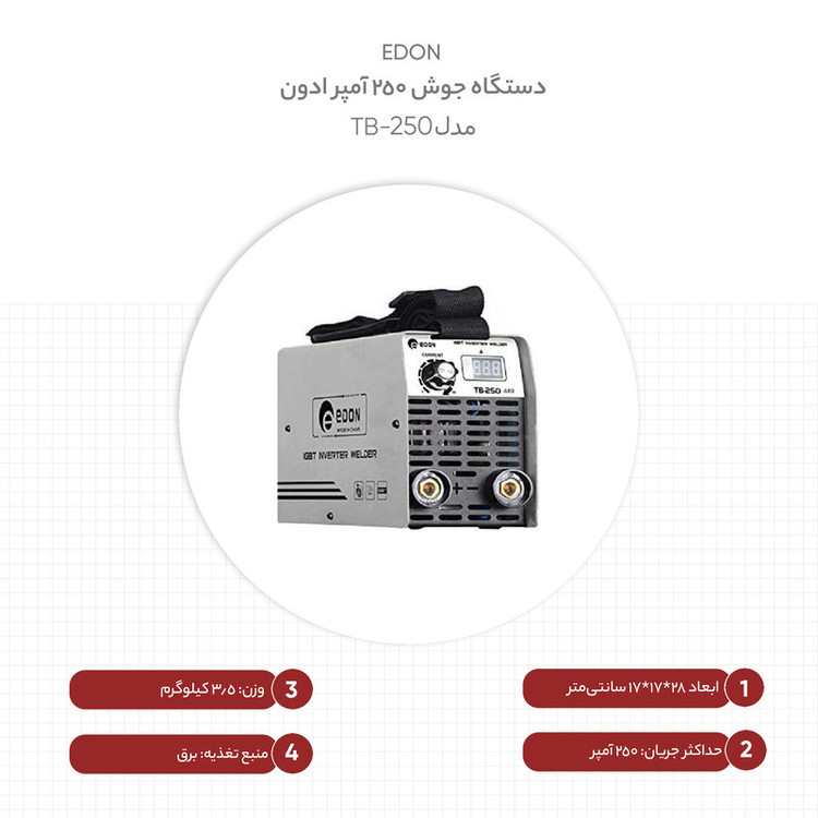 ابعاد ۲۸x۱۷x۱۷ سانتیمتر وزن ۳.۵ کیلوگرم انبر دارد چرخه جوشکاری - حداکثر جریان ۲۵۰